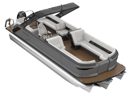 Details: Center In Tube Storage - Extra Battery and Smart Switch - Privacy Station Curtain - High Back Helm Chair w/Bolster - Rear Stereo Remote - Wireless Charging Pad (Helm)- Preinstalled LinQ Attachments On Top of Wall (6) - Sport Bimini, Black, Forward Folding w/Gas Assist (50mph Rating) - Trifold Bench, Starboard - Dual Rear Switchback Loungers - Dual Front Loungers - Navigator's Chair, Port - Integrated Cup Holders - Passenger USB Charging Ports, Front and Rear - Underseat Tub Storage - Storage Cubbies, Interior Side of Each Helm - Ski Tow Bar - Boarding Ladder - Woven Vinyl Flooring - Mooring Cove - Navigation Lights, LED - Docking Lights, LED - Interior Flooring Lights, LED (2 Front, 2 Mid, 2 Rear) - Fusion RA-210 Stereo - 6.5" Fusion Speakers (4), G- 9" Garmin Touchscreen Display- Navigator's Helm with Dry Glove Box - USB Charging Port, Navigator's Helm - Push Button Switching- Gas Tank, 43 Gallon- Steering, Power - Formed Aluminum Walls - V-Toon Hull - Reinforced Nose Cones - Anti-spray integrated splash fins - Lifting Strakes (6) - Molded Foam Seats - 100% Composite Decking - Crossmembers, Extruded Aluminum - Lift Gate, Powder Coated - Simtex Marine Vinyl - Mooring Cleats, Stainless Steel (4) - NMMA Certified using ABYC Standards - Pontoon Tube Riser, Fulllength - Powder Coated Rub Rail - Riser Brackets, "M" Style - Transducer Bracket